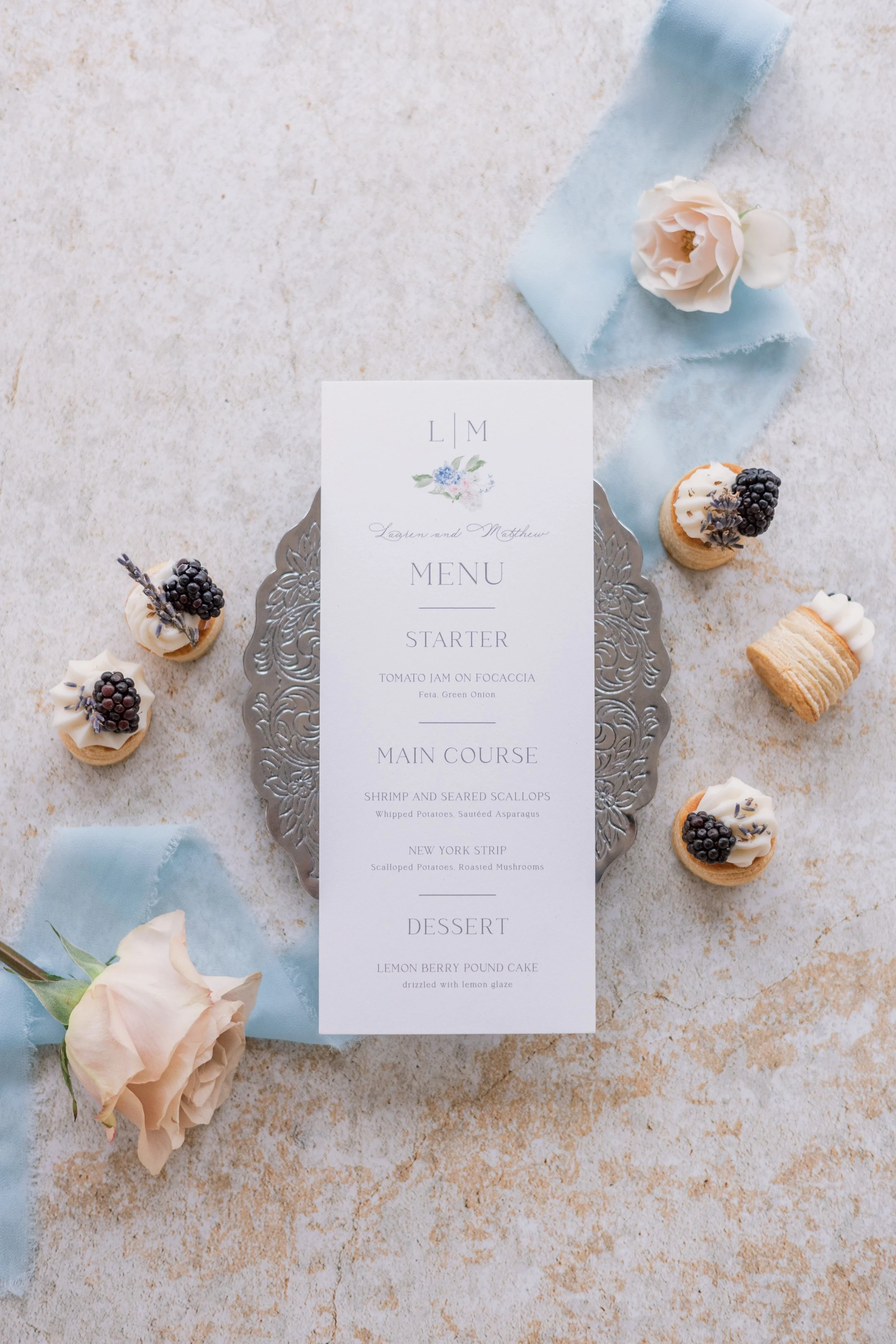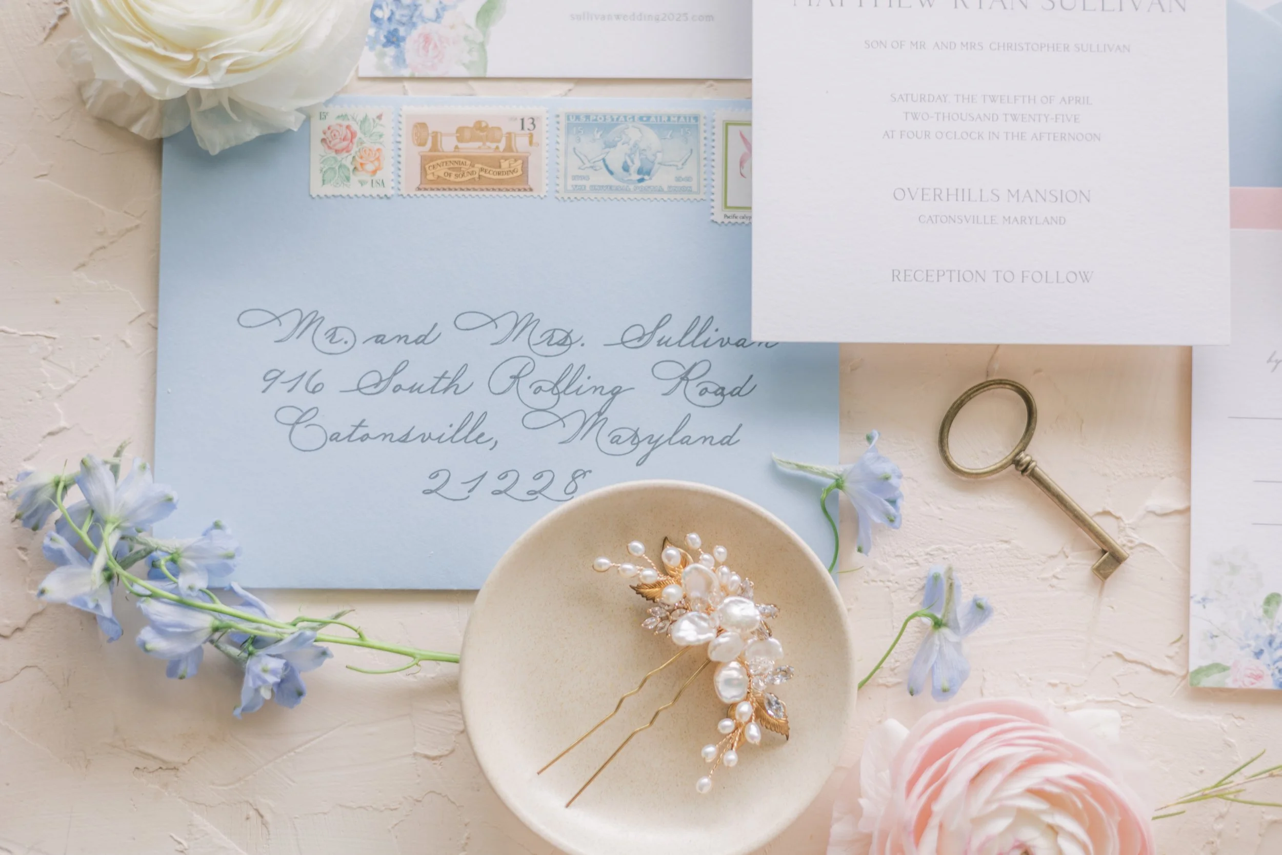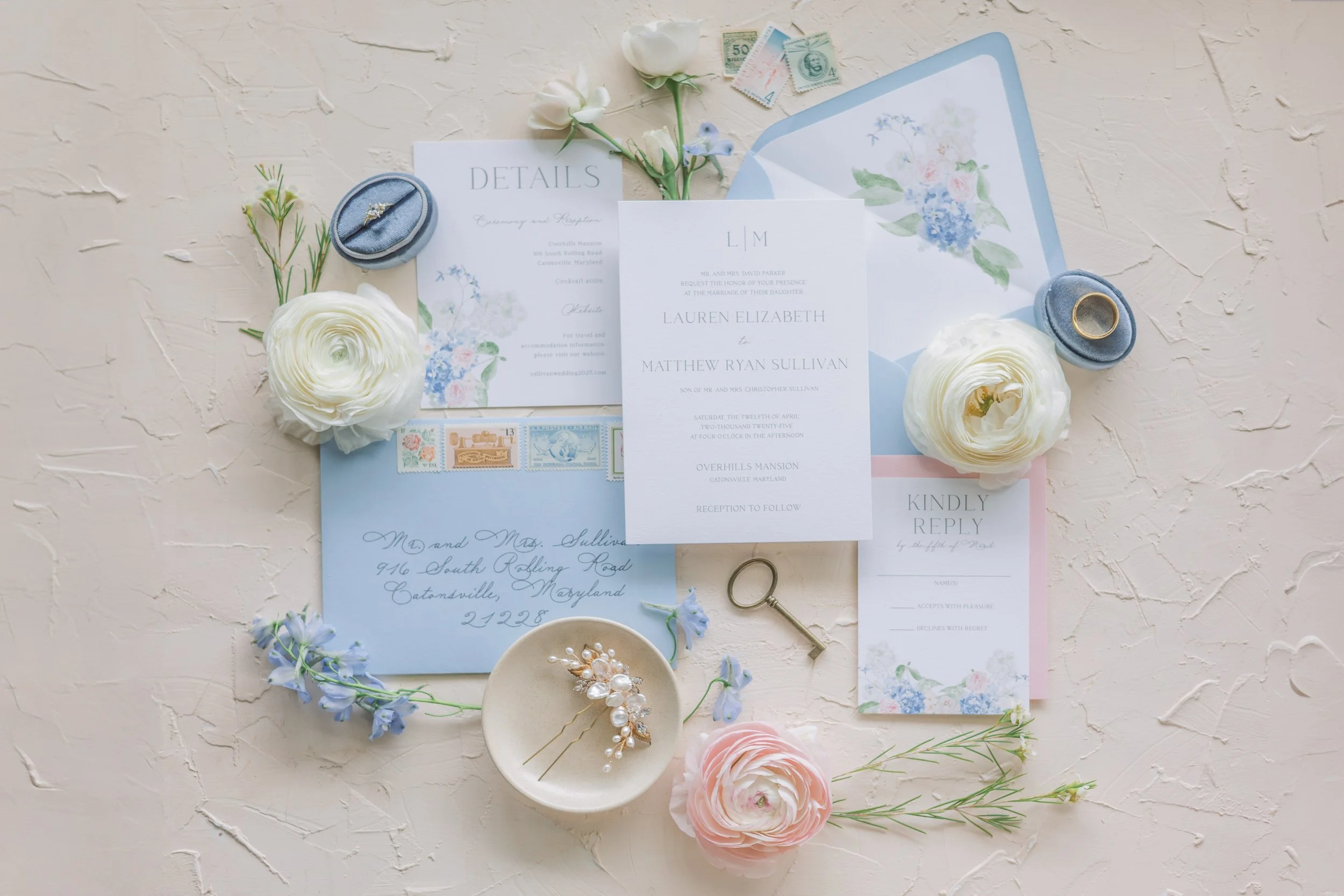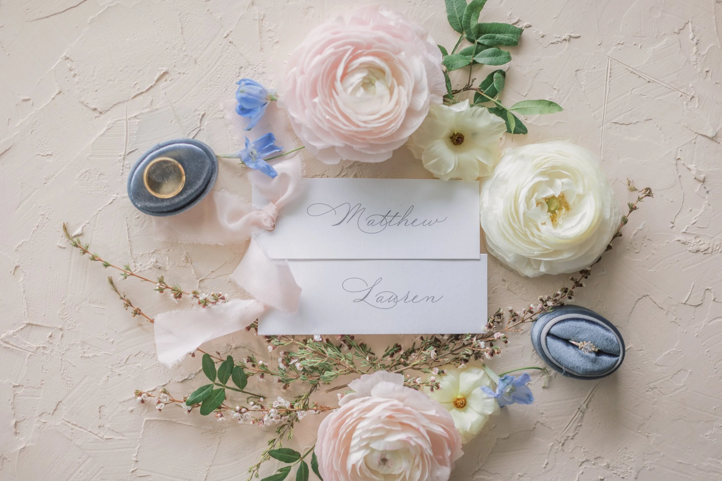 Pale blues, soft blush tones, and creamy whites were woven throughout the design—from the garden-inspired bouquet to the refined flat-lay details. The stationery and accessories complemented the overall aesthetic without overpowering it, keeping the focus on craftsmanship, texture, and restraint.