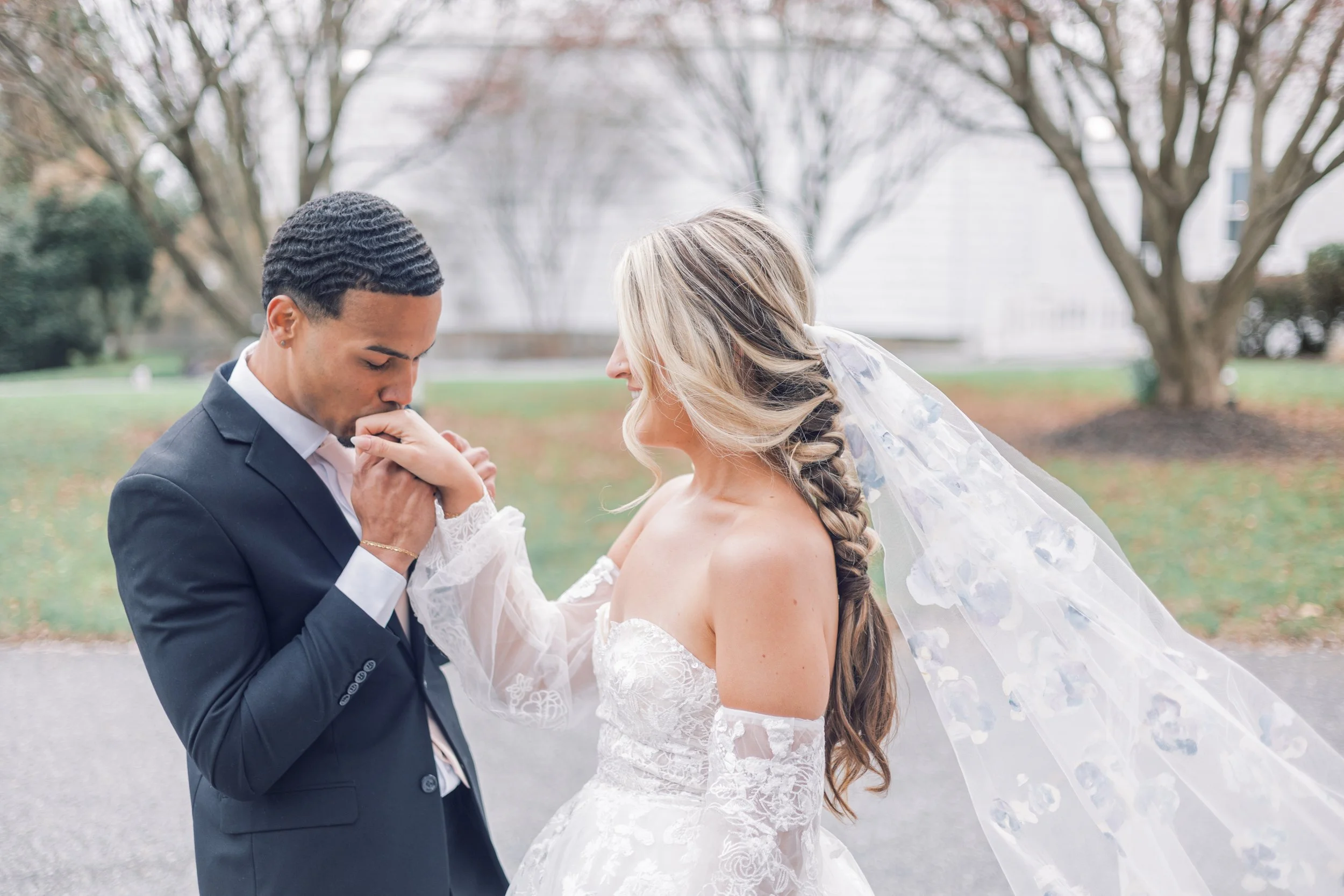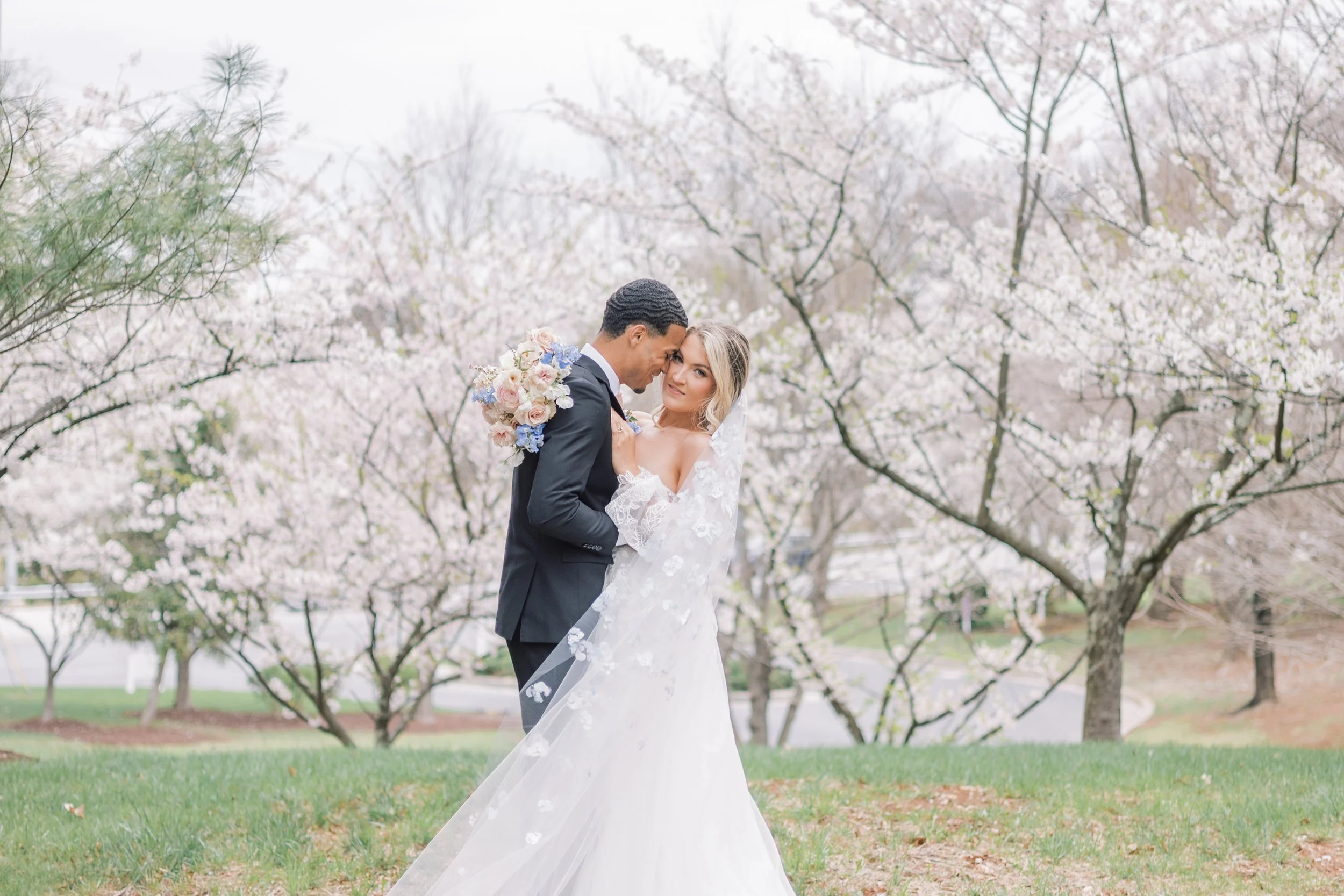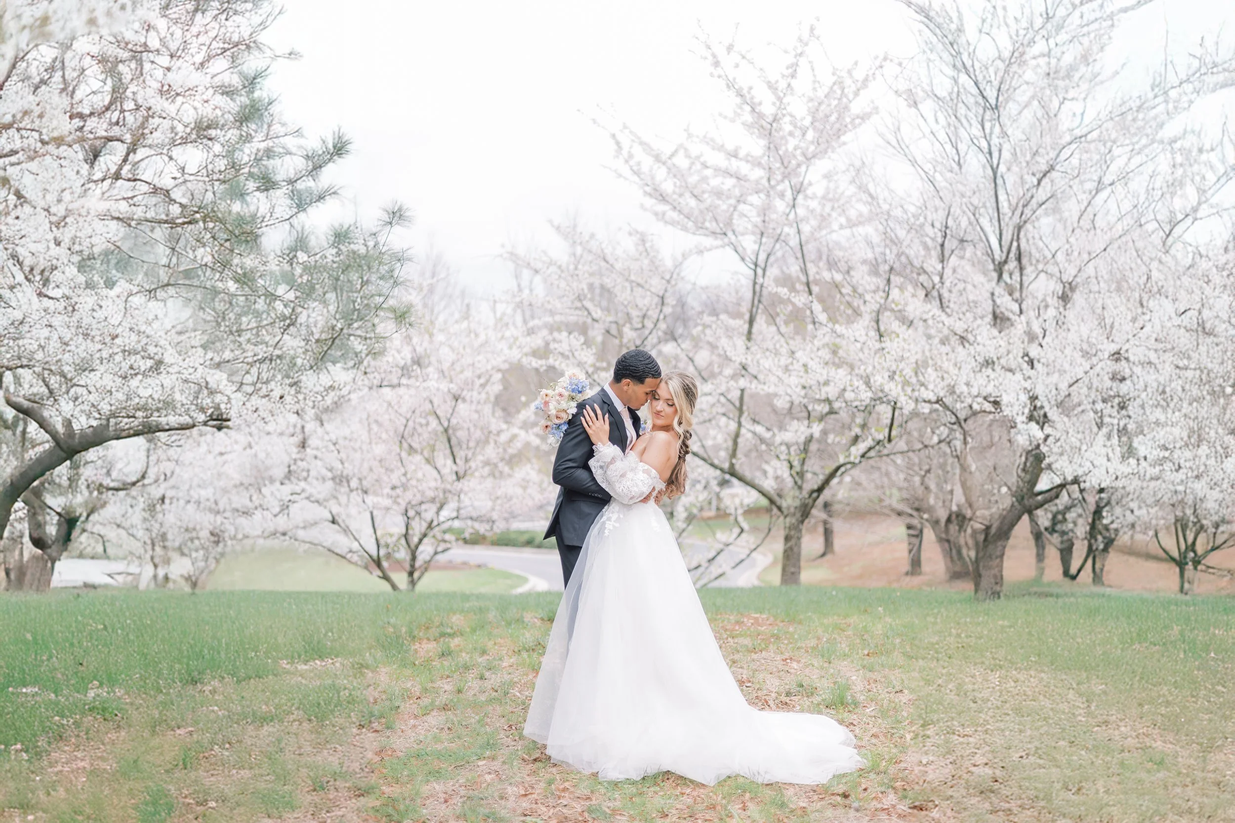 The cherry blossoms were truly the heart of this shoot! They were showing off for us. Branches of delicate white florals created a natural, dreamlike setting for Jordan + Mikah’s portraits. Their love was so easy to photograph. It was like an ethereal, flowery, dream! Mikah’s classic black suit anchored the look, while Jordan’s off-the-shoulder lace gown added softness and movement.