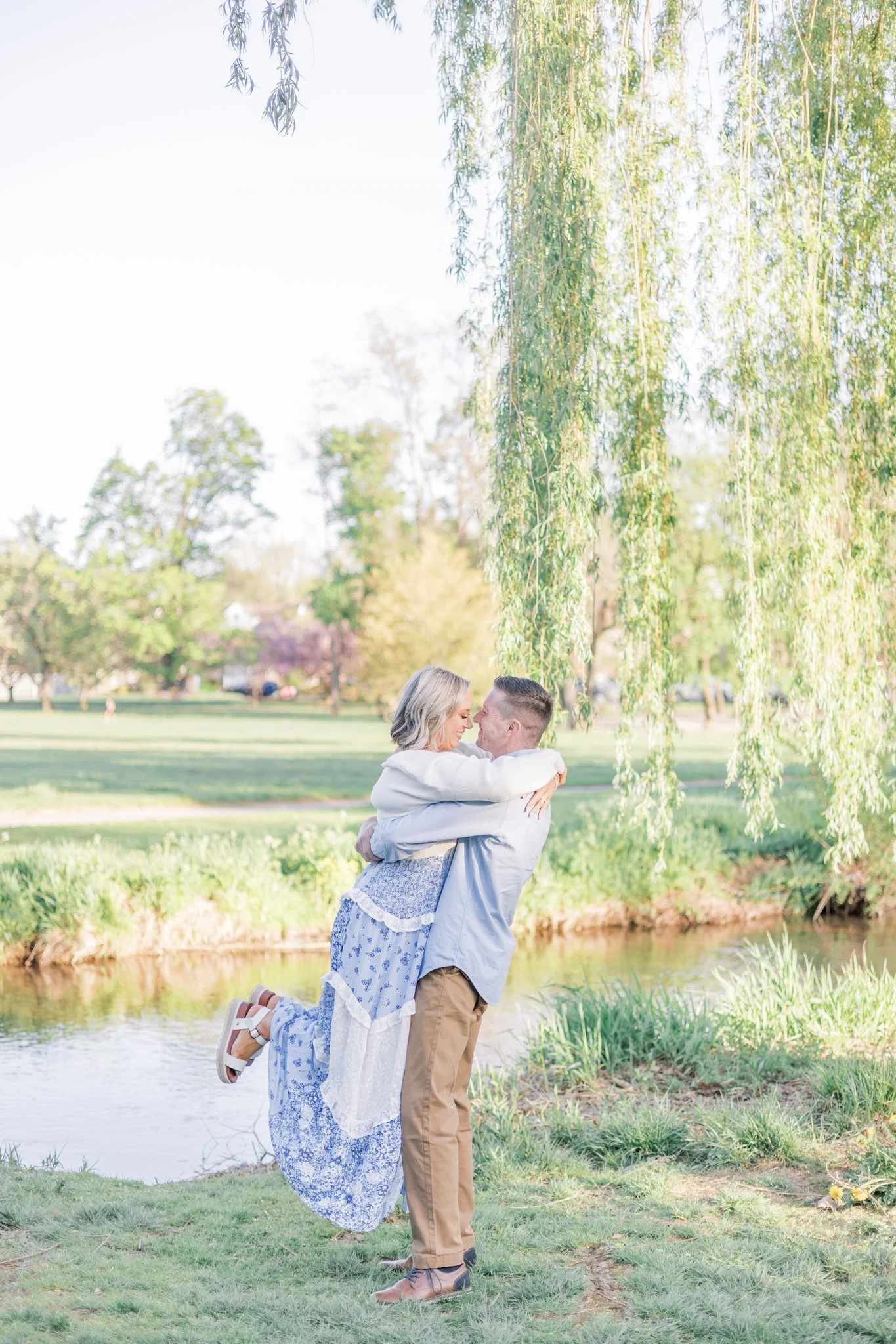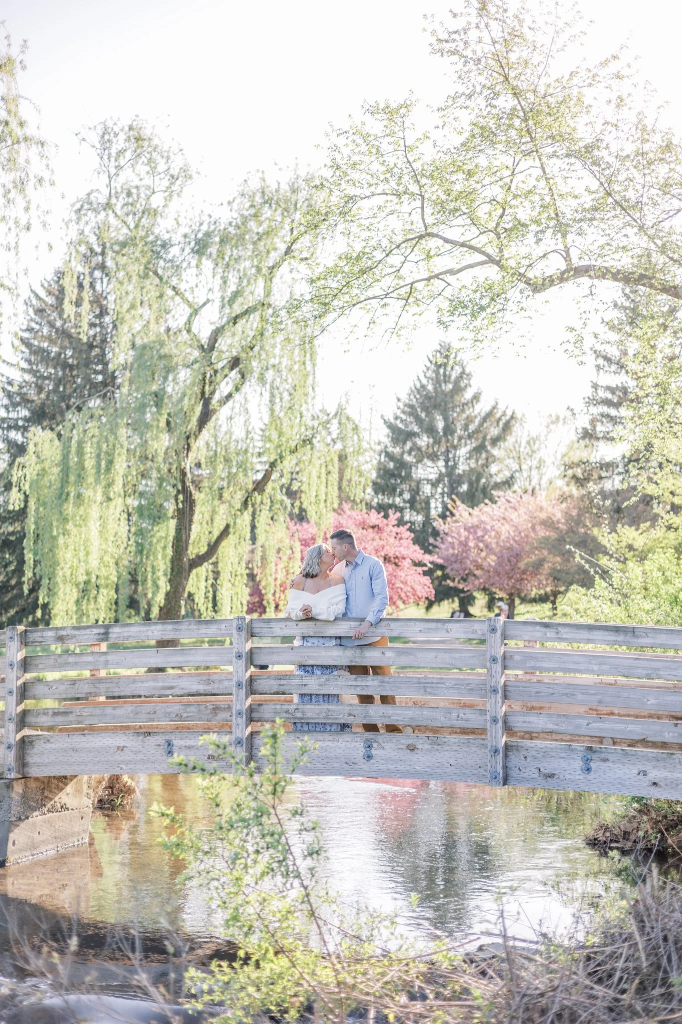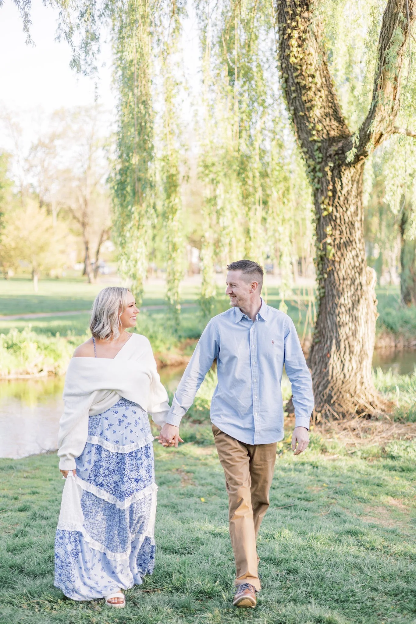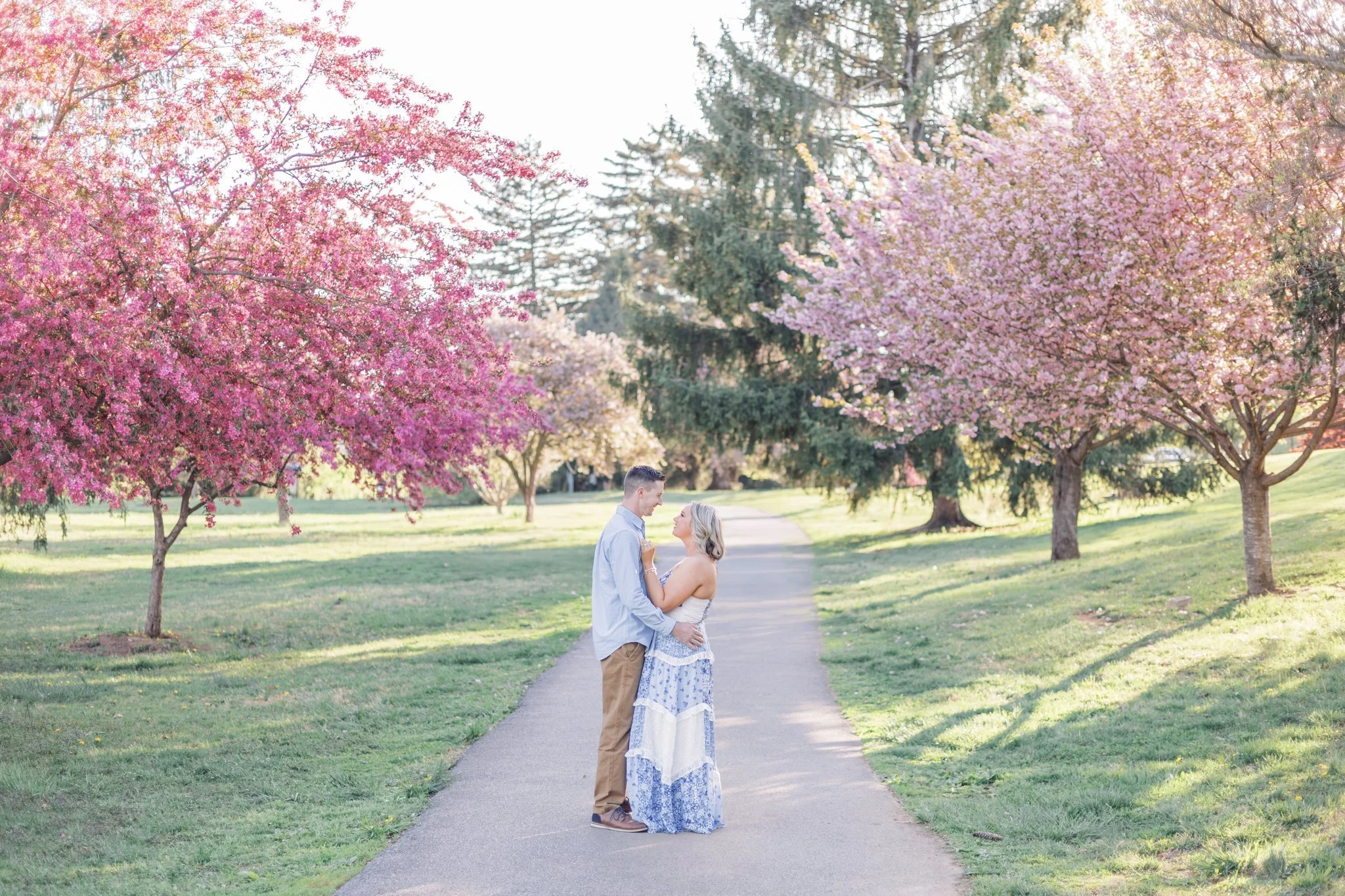 An evening in April at the Allentown Rose Garden was the perfect setting for Samantha + Addison’s engagement session! Soft, romantic, and full of spring warmth. The garden felt especially alive that day, with pink flowering trees lining the walking paths and golden sunlight filtering gently through the leaves overhead.